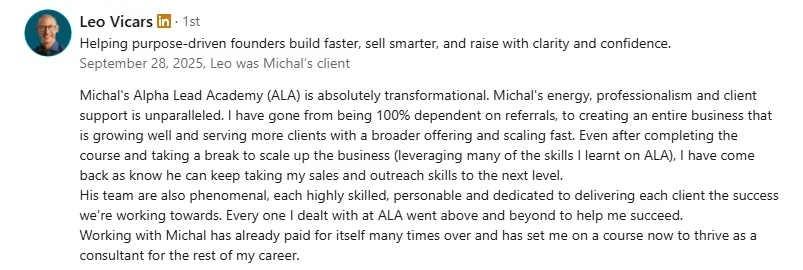 Leo Vicars helps startups raise capital. He started with 1 client from within his network. He implemented our LinkedIn DM strategy & made it work for himself through determination and grit.